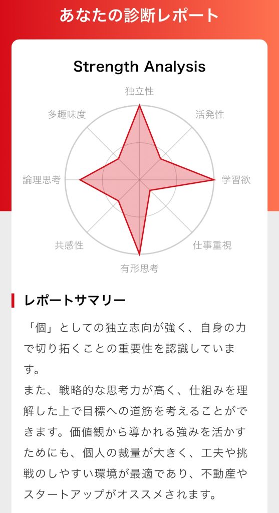 8項目の価値観のレーダーチャートとサマリーをもとに、強みやその活かし方まで詳しく解説されています。
