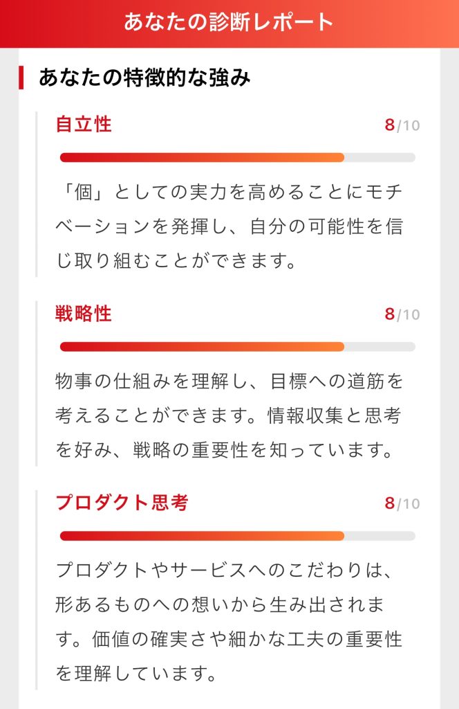 経歴の入力と価値観に関する24個の質問に答えると、以下の2つのレポートが作成されます。